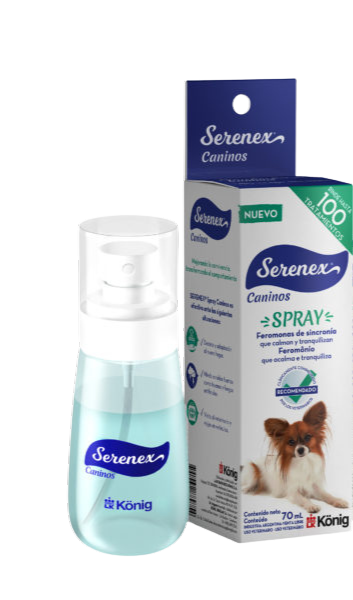 SERENEX® Spray Caninos libera desde el sitio del rociado, feromona M2. Estas feromonas, con acción análoga a las secretadas naturalmente durante la maternidad canina, ayuda a controlar conductas inadecuadas en los caninos.