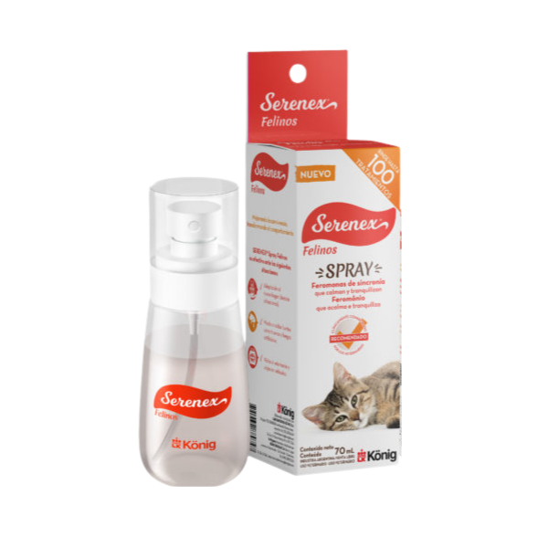 SERENEX® Spray Felinos libera desde el sitio del rociado, feromonas M2B. Estas feromonas, con acción análoga a las secretadas naturalmente durante la maternidad y las feromonas faciales, ayuda a controlar conductas inadecuadas en los felinos